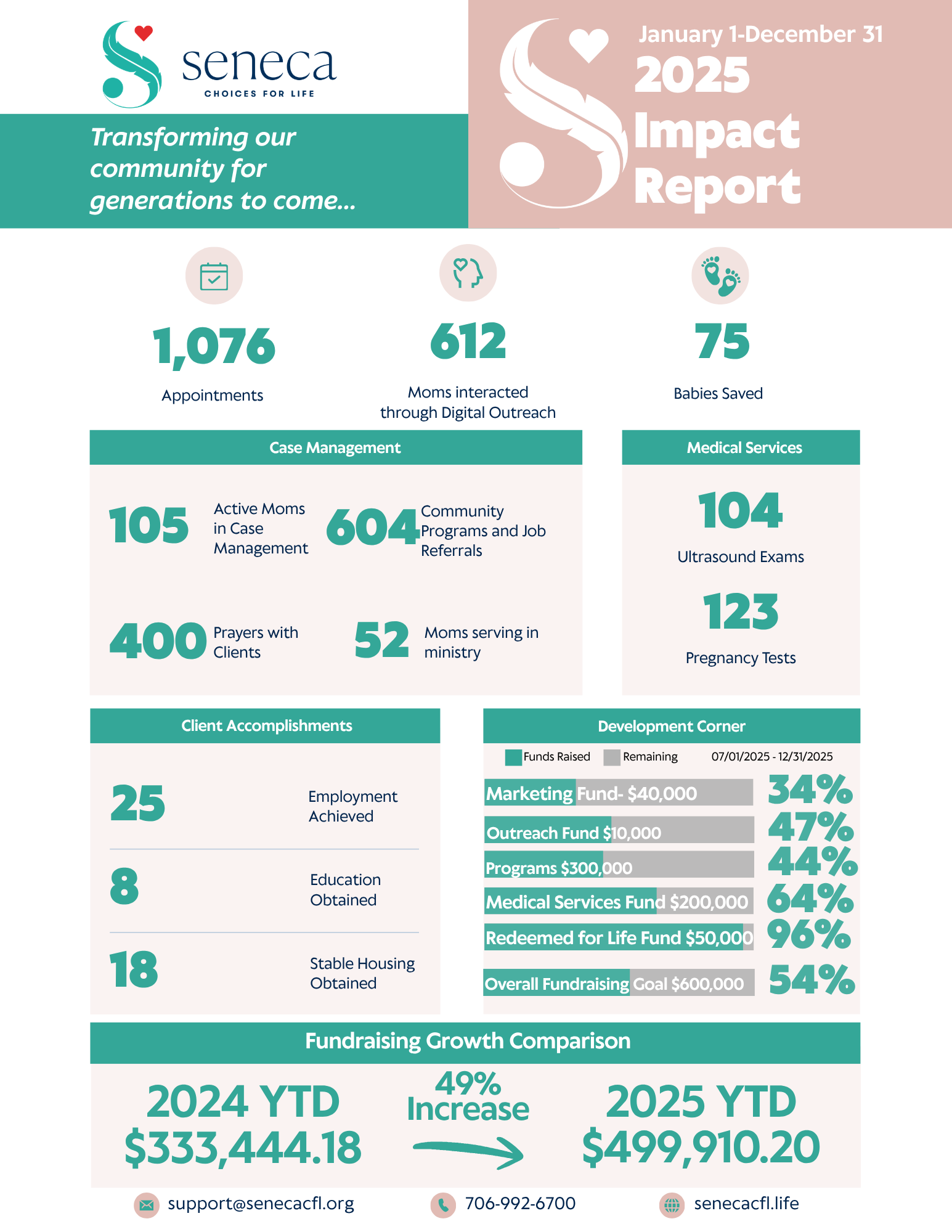 Please review our current Annual Impact Statement, and see how you’ve helped Seneca show women that they truly have a choice when it comes to motherhood and their babies.